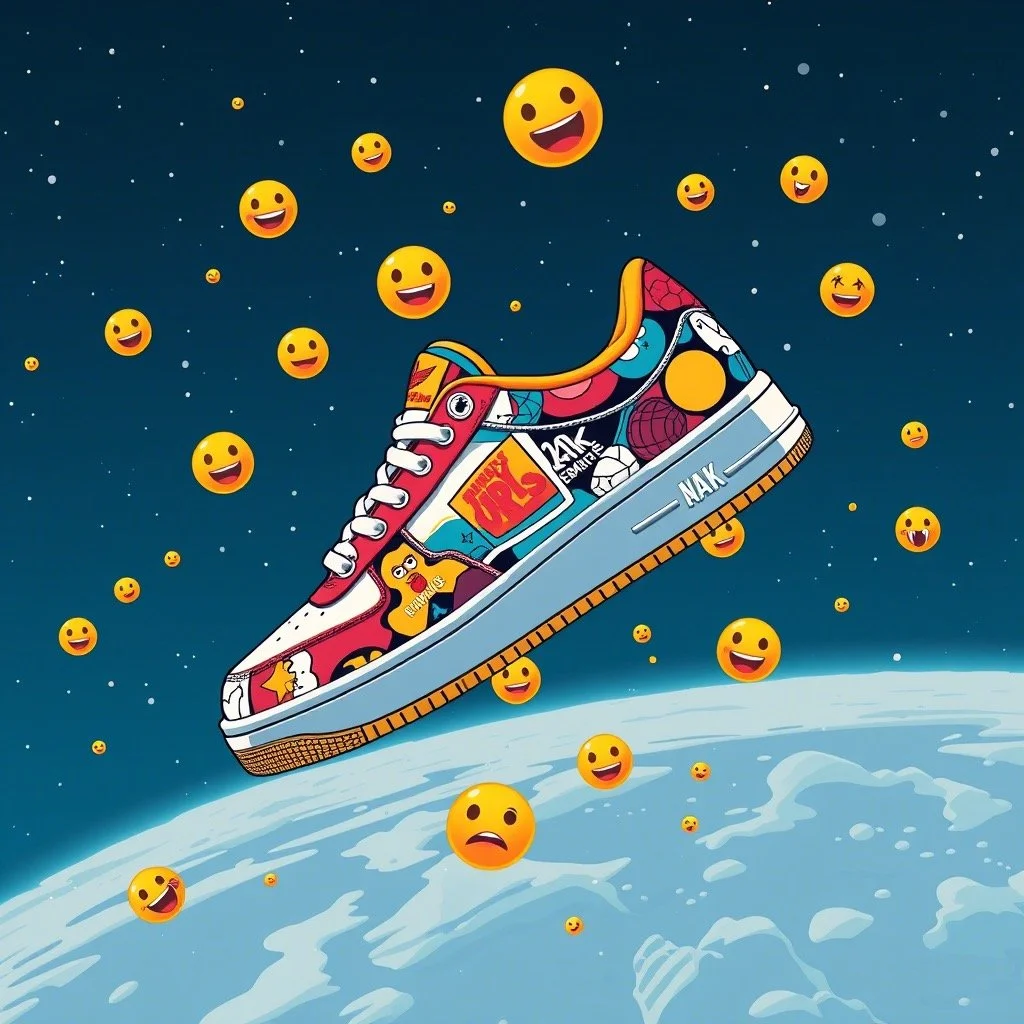 Product Mockup Prompt (Neo-Pop): “A sneaker floating in space, covered in bold comic book patterns, surrounded by floating emojis, in the style of Takashi Murakami, bright neon colors, ultra-clean vector style”